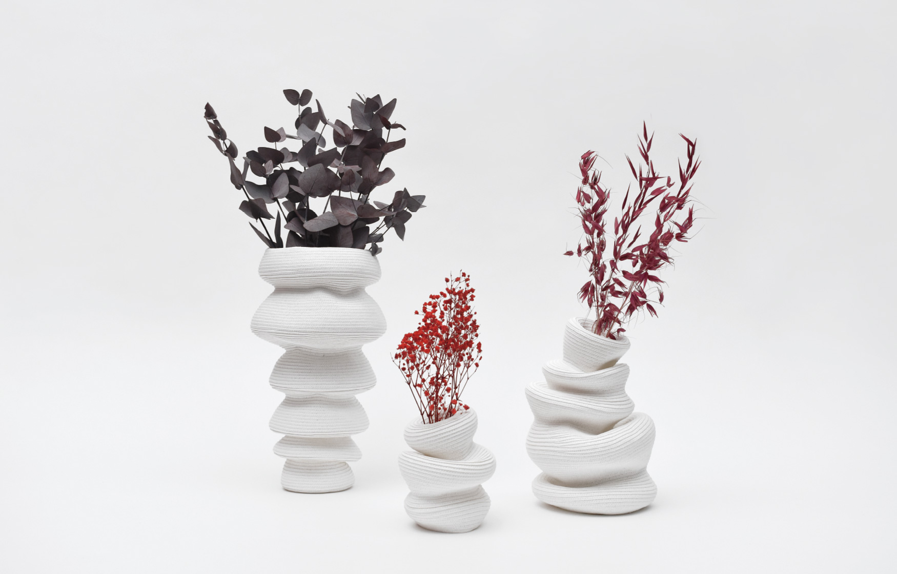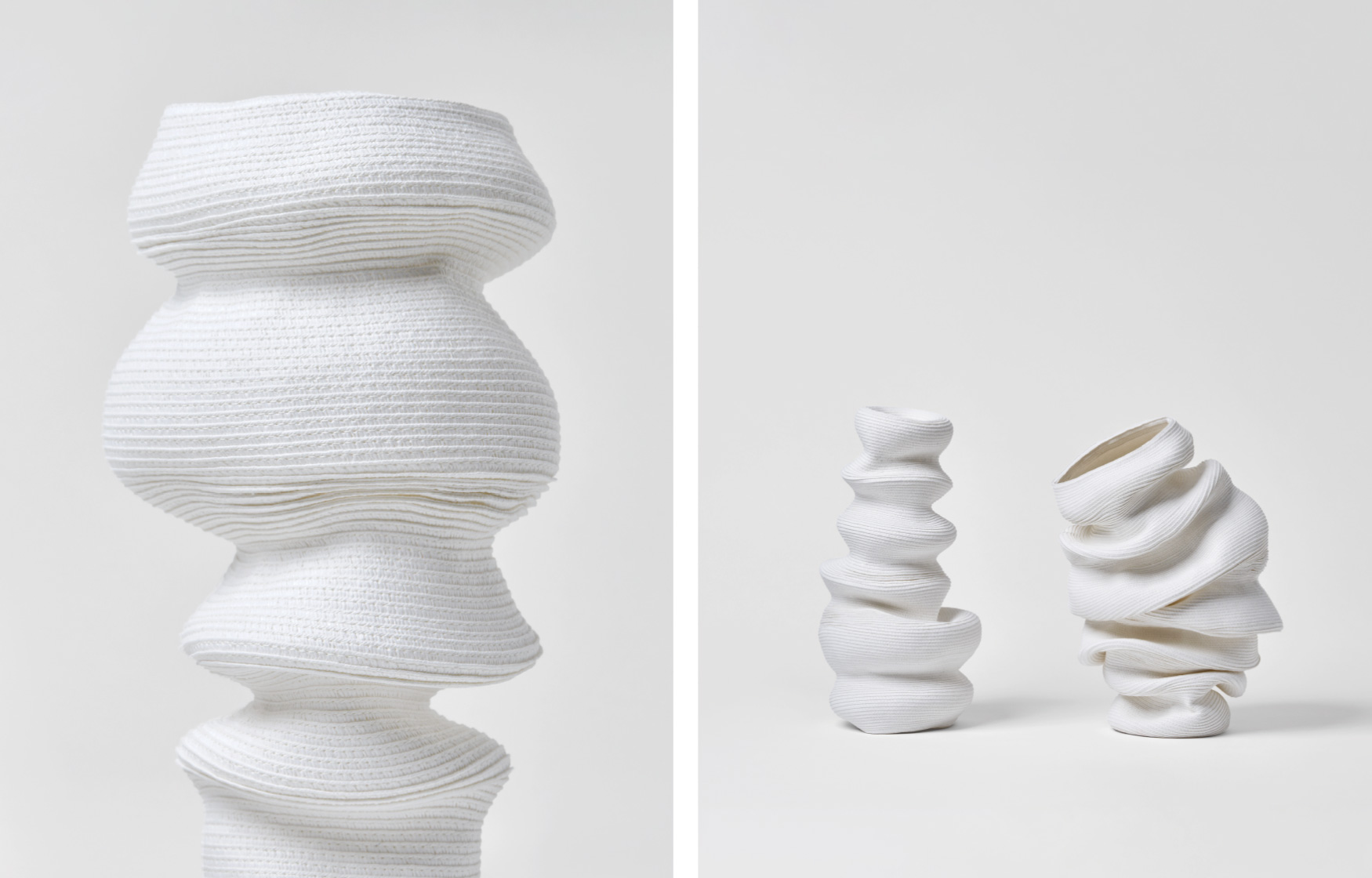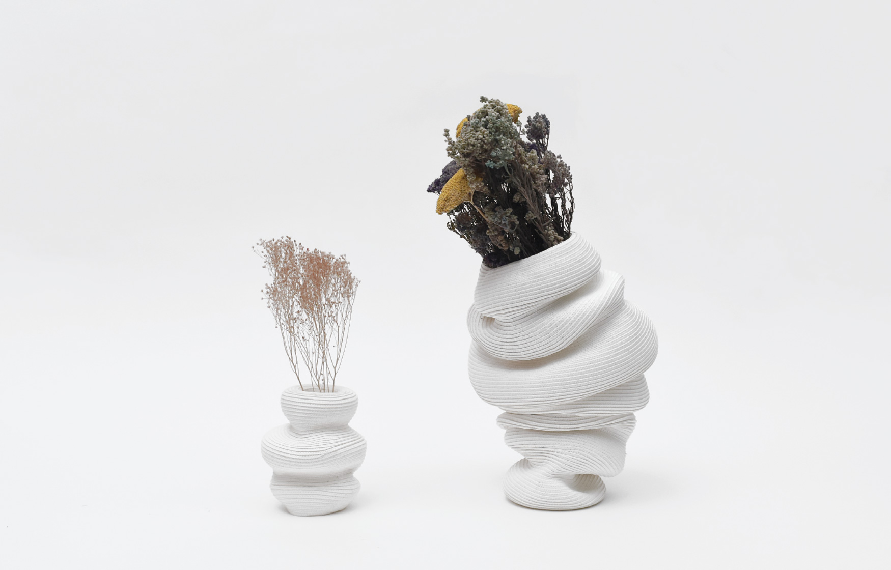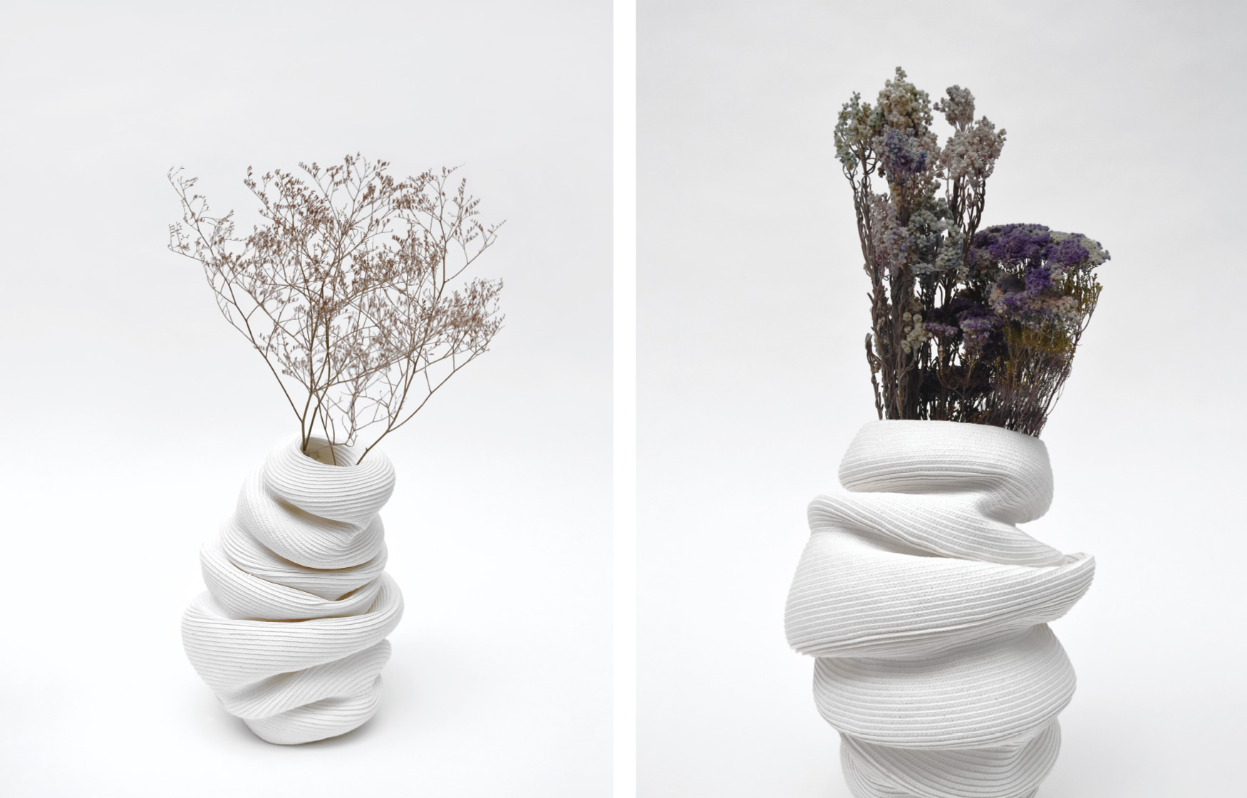 伸びたり縮んだり、傾いたりひっくり返ったり。永遠とはいかないまでも、ビバンダムはあなたを飽きさせない顔をいくつも見せてくれます。今日はどんな表情を見せてくれるでしょうか? ふっくらした丸みやシャープな丸み。異なる丸みのジャバラ形状を基本とし、部分的にアシンメトリーに縫うことで形状にアクセントが生まれ様々な表情を見せてくれます。ジャバラならではの伸縮時の心地良い感触を楽しみながらお気に入りの形を見つけてください。 マットで白いこの素材は80%リサイクルペーパーで構成され、肌触りの良いしっとりとした質感で空間にナチュラルな清潔感を与えてくれます。 単品でも十分に楽しめるビバンダムですが、ドライフラワーに合わせて形状を変化させたり、形状に合わせてドライフラワーを合わせたり、様々な楽しみ方が可能です。