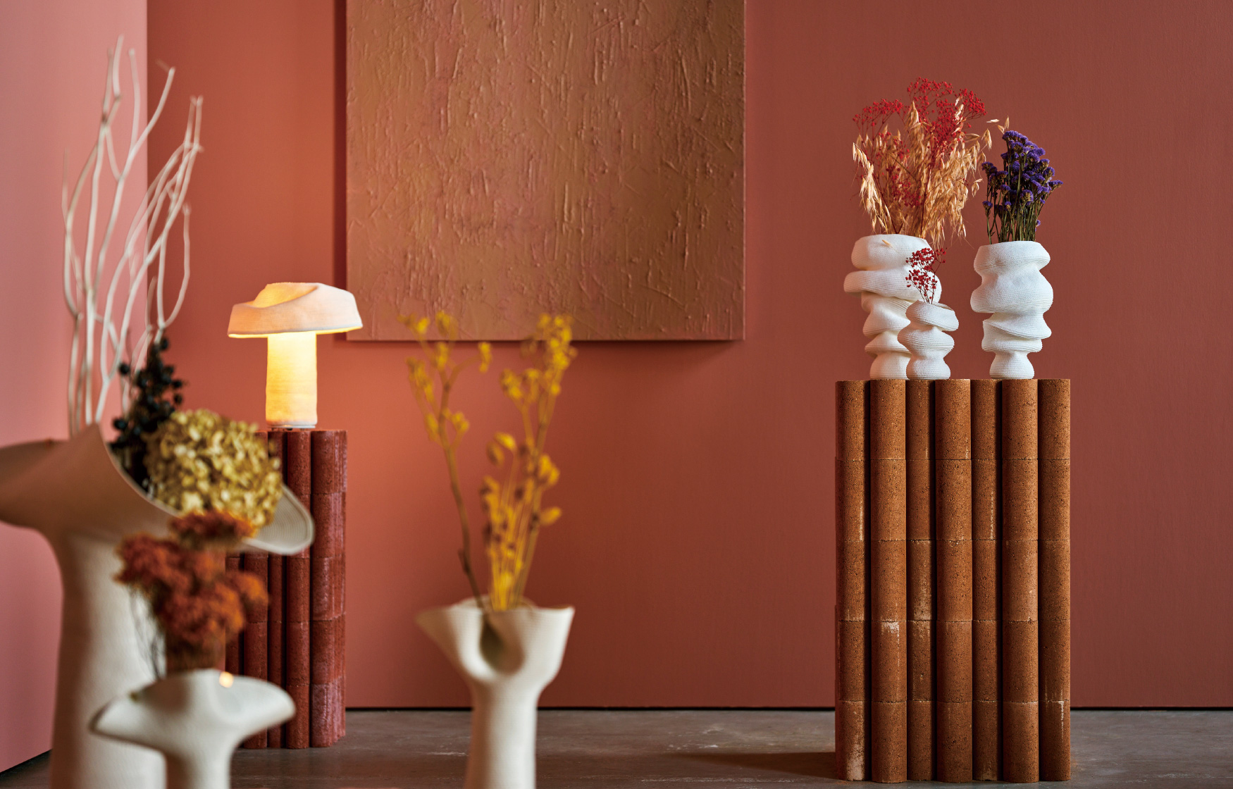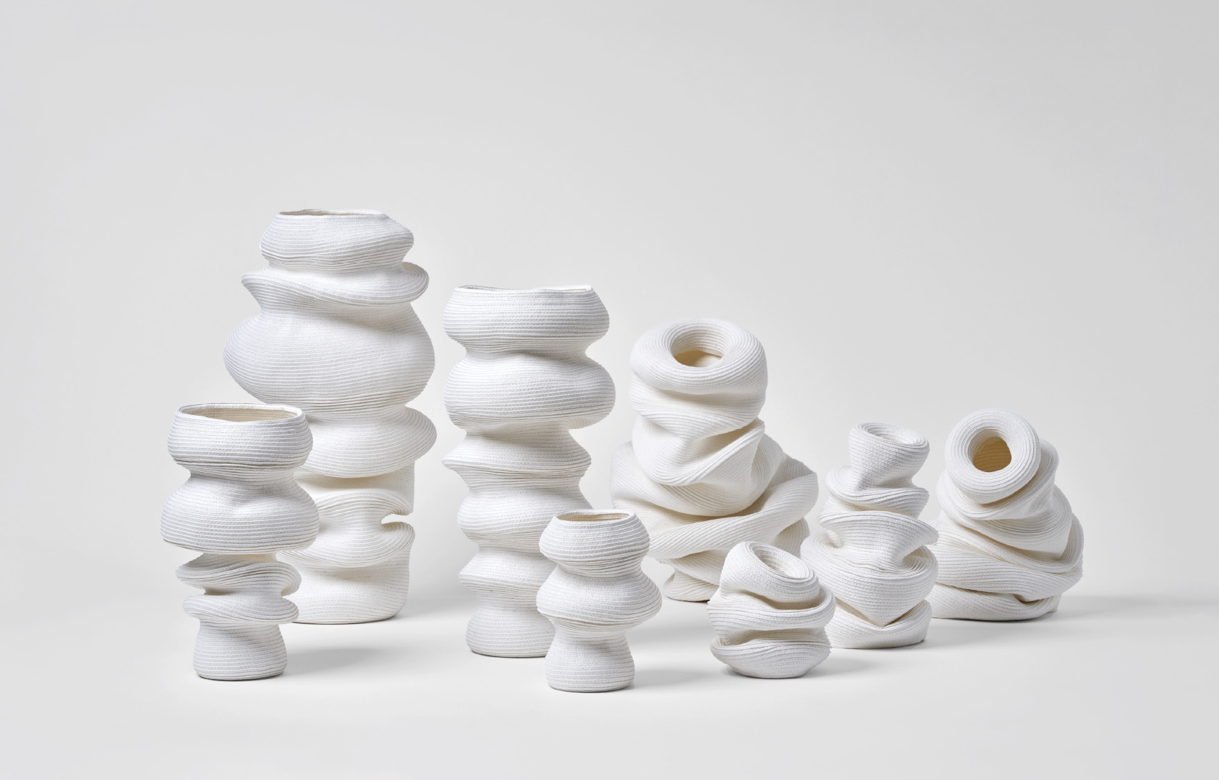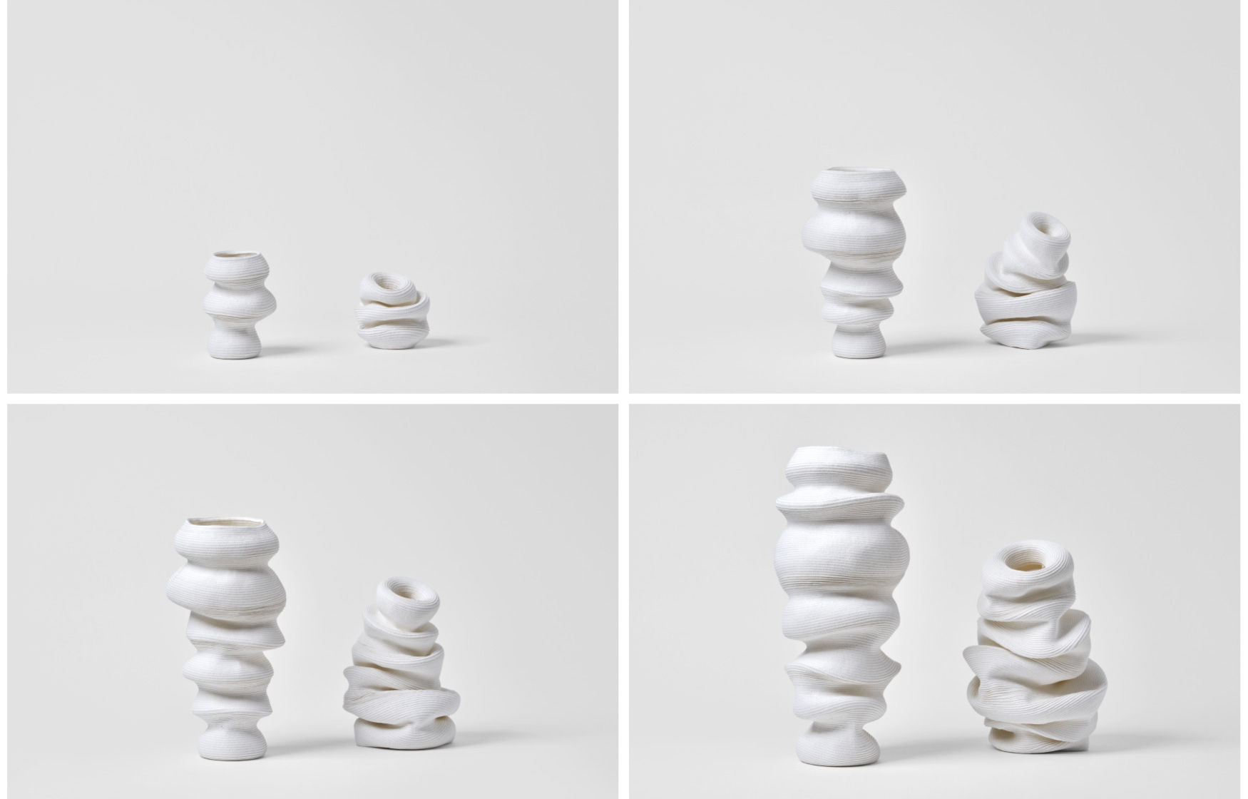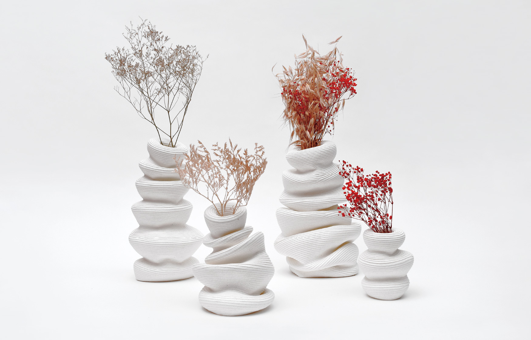 伸びたり縮んだり、傾いたりひっくり返ったり。永遠とはいかないまでも、ビバンダムはあなたを飽きさせない顔をいくつも見せてくれます。今日はどんな表情を見せてくれるでしょうか? ふっくらした丸みやシャープな丸み。異なる丸みのジャバラ形状を基本とし、部分的にアシンメトリーに縫うことで形状にアクセントが生まれ様々な表情を見せてくれます。ジャバラならではの伸縮時の心地良い感触を楽しみながらお気に入りの形を見つけてください。 マットで白いこの素材は80%リサイクルペーパーで構成され、肌触りの良いしっとりとした質感で空間にナチュラルな清潔感を与えてくれます。 単品でも十分に楽しめるビバンダムですが、ドライフラワーに合わせて形状を変化させたり、形状に合わせてドライフラワーを合わせたり、様々な楽しみ方が可能です。