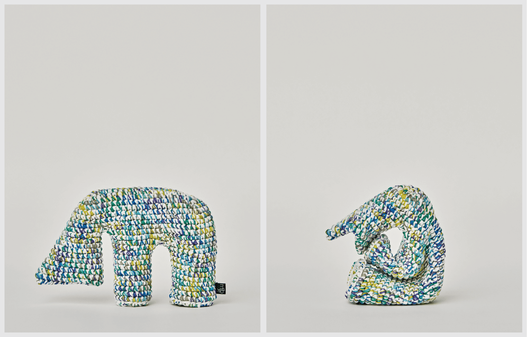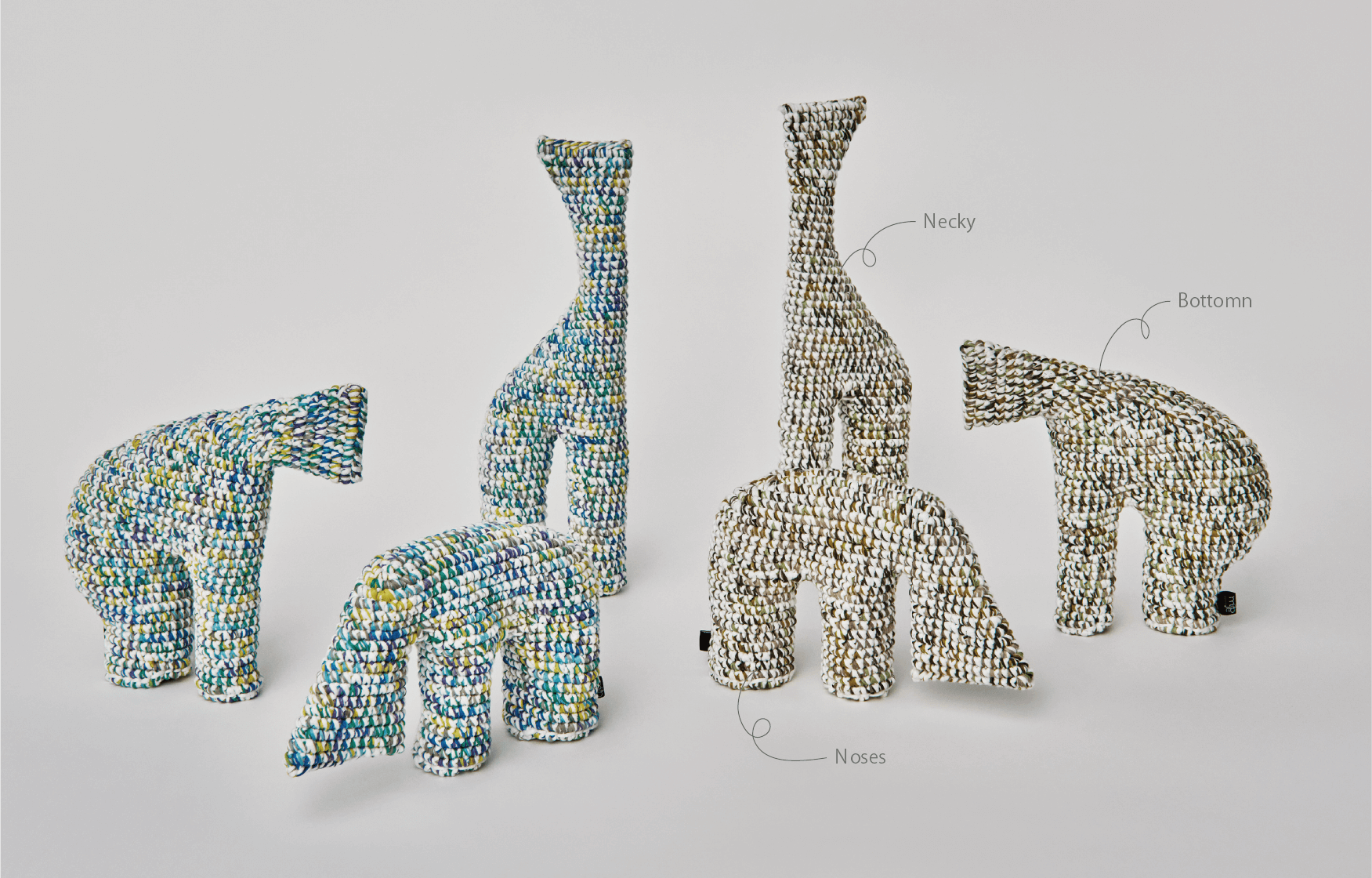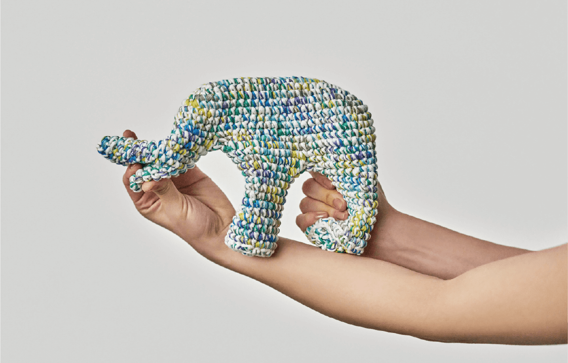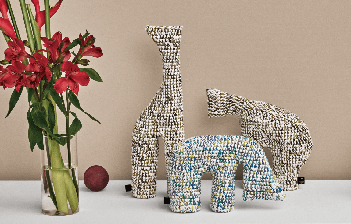 For the “I am” line of products, we mainly use a special, space-dyed cotton paralleled yarn with cushioning properties. Each product is crocheted carefully, one at a time, by skilled craftsmen. Unlike ordinary stuffed animals, “I am” have no cotton inside, due to the strength of crocheting and the properties of the material used.These features allow “I am” to be shaped into a variety of forms.Children might be able to transform them into a variety of things, beyond the imagination of adults. Adults might shape them into appealing decorations. And children might discover something new when they see these decorative shapes.From children to adults. From adults to children. You can use “I am” for non-verbal communication.That is the hope of “I am”.