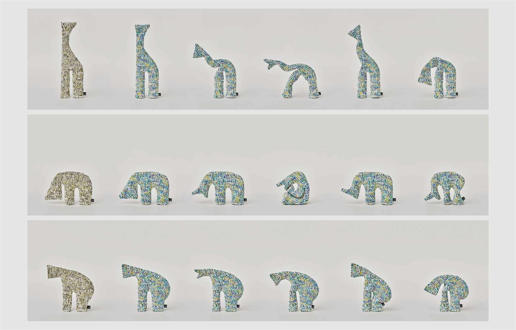 I am(アイアム)はクッション性のある特殊な綿糸をメインに、かすり染めされた綿糸を引き揃え、熟練の職人が1つ1つ丁寧に編んでいます。編む際の力加減や素材の特性を活かし、I amには一般的なぬいぐるみとは異なり中にワタが入っていません。その特徴が、I amを様々な姿に変えてくれます。子供達は大人達の想像を超えて、色々なものに変身させてくれるかもしれません。大人達はそれをよりよく見えるように飾ったりするかもしれません。飾られた姿をみて子供達がまた何かを感じることがあるかもしれません。子供から大人に。大人から子供に。I amを使って言葉以外のコミュニケーションが生まれること。それがI amからの想いです。