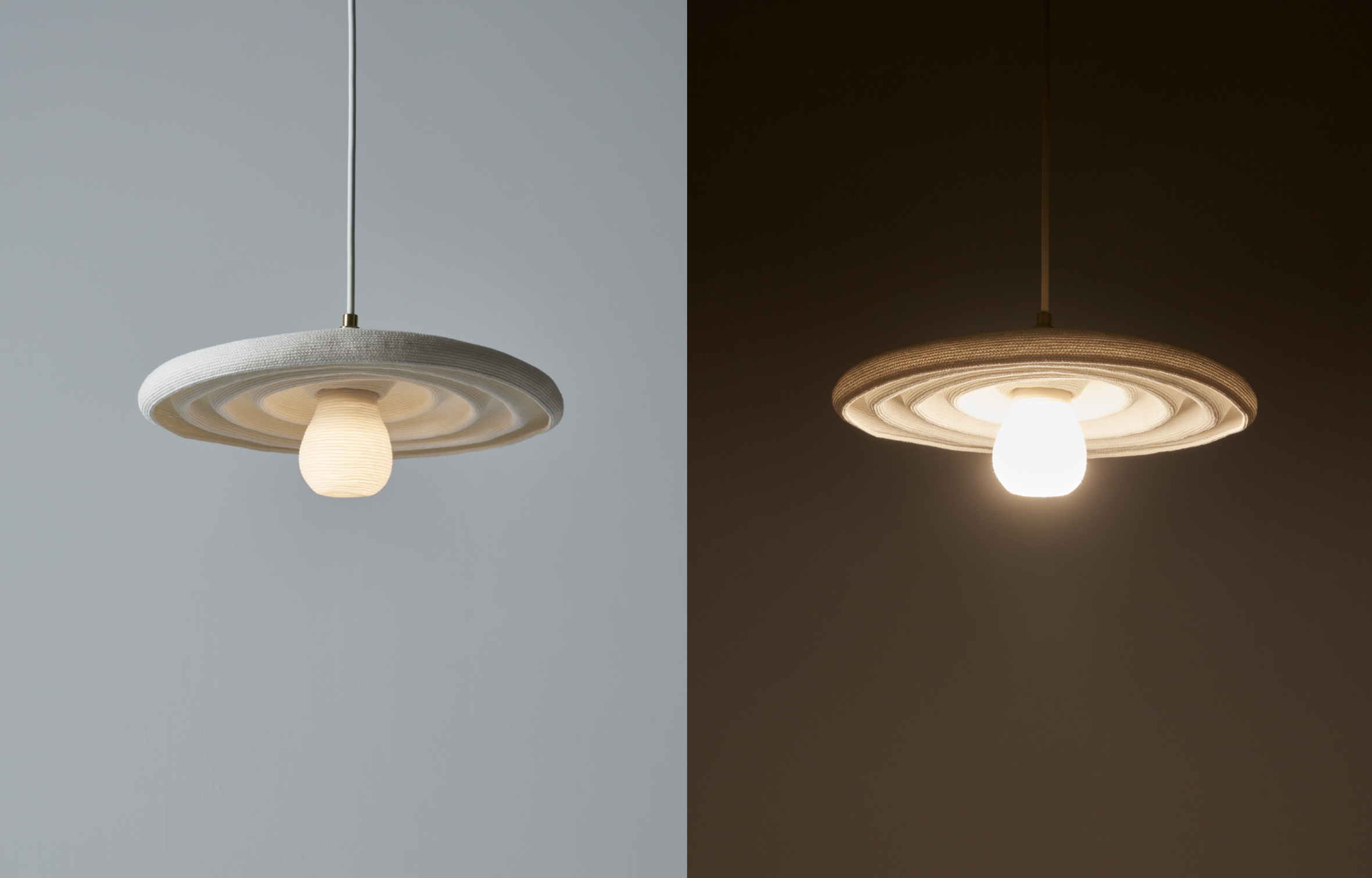 水の波紋からインスピレーションを受けたこのposinglightは、光の雫が水に落ちた瞬間を基本形状とし、そこからの光の広がりをフォルムの変化と共に楽しむことのできるペンダントライトです。シェード部分は透過性、保持力に優れた和紙素材を主体に構成され、透過した表情と、光を受ける内側の表情にはそれぞれ異なる美しさがあります。電球も光源が直接目に触れないように専用カバーによって覆われ優しい光が空間に広がります。波紋の様なリブ形状がフォルムの変化のガイドにもなり、片方だけ下げれば光の方向性をつくることもできます。また元の形状に戻す際も、リブに沿って馴染ませていくことができます。シェードを完全に下げれば深いシェードのペンダントライトとなりシーンに合わせて様々なフォルムを光を整えながらお楽しみください。