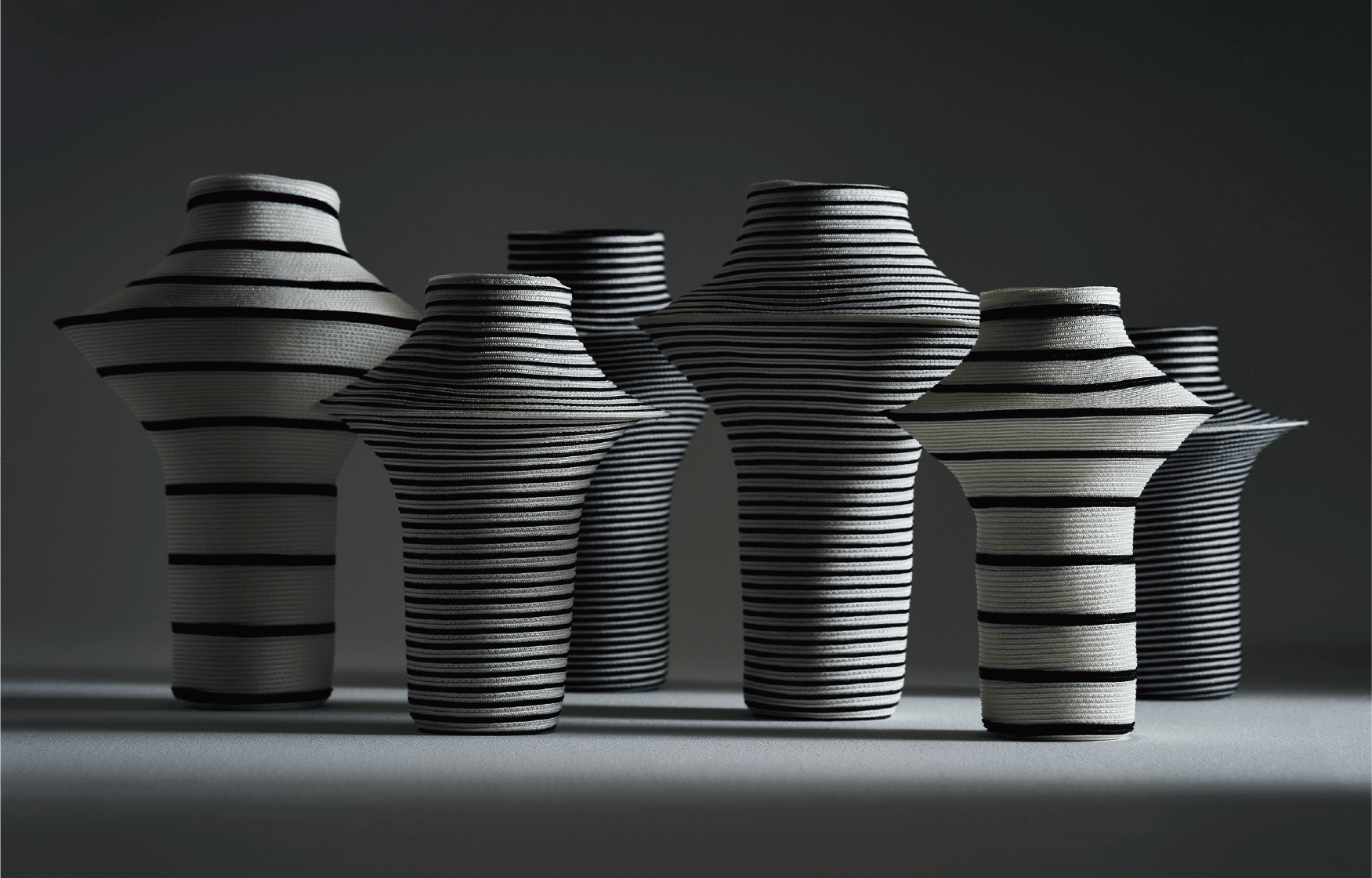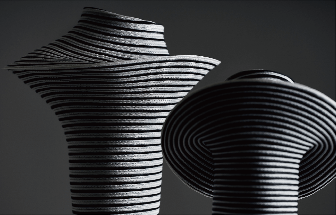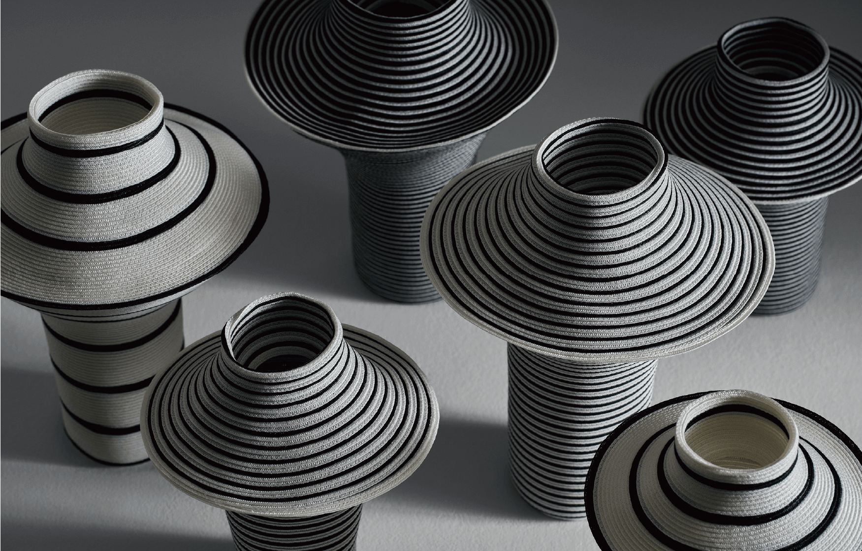 stripe stripe : Interior décor featuring three variations of stripes sewn in different patterns.Depending on your perspective, some stripes run horizontally while others draw arcs. Do nothing and they seem to stand silently like solid structures.Or, shape them so the stripes exhibit a sense of dynamic change, as if they have a life of their own.Spin them around, they appear to be dancing.Whether alone in the spotlight,or sharing the stage with flowers,they add glamor to any room. So, what kind of stripes shall we enjoy today?