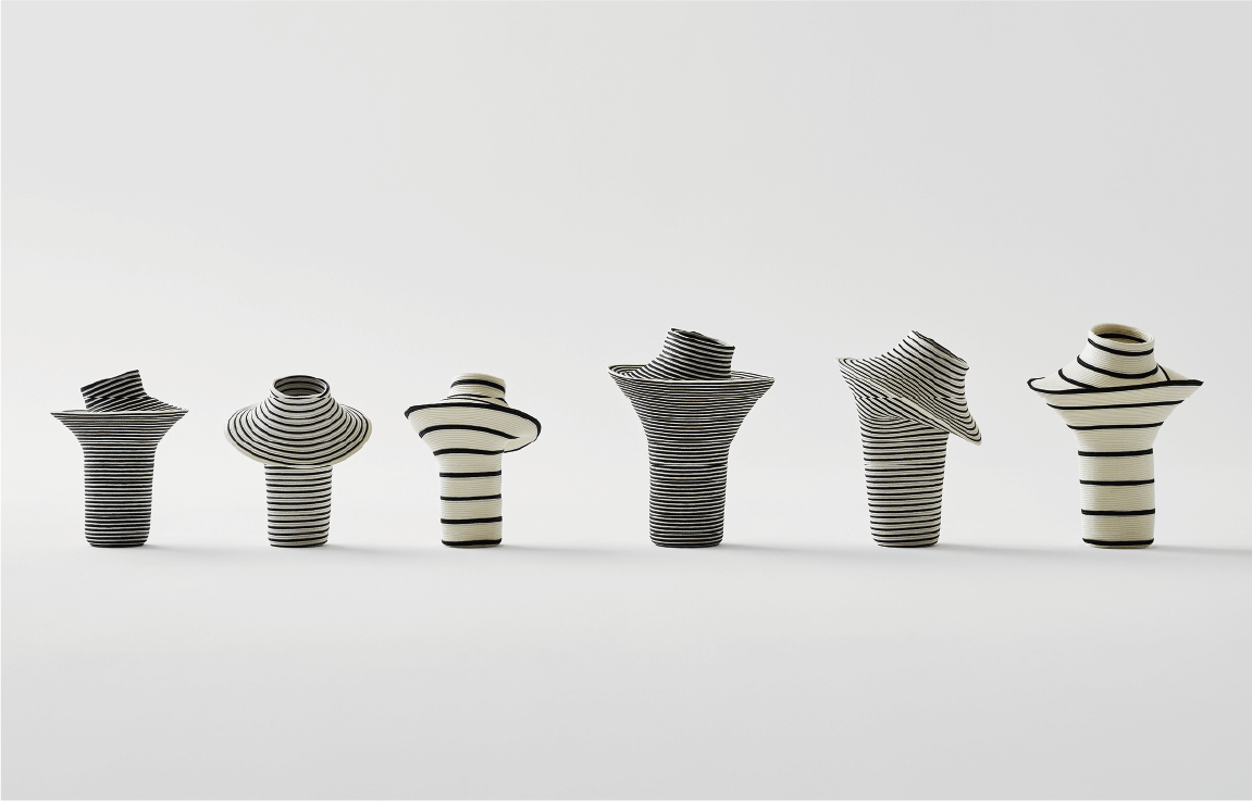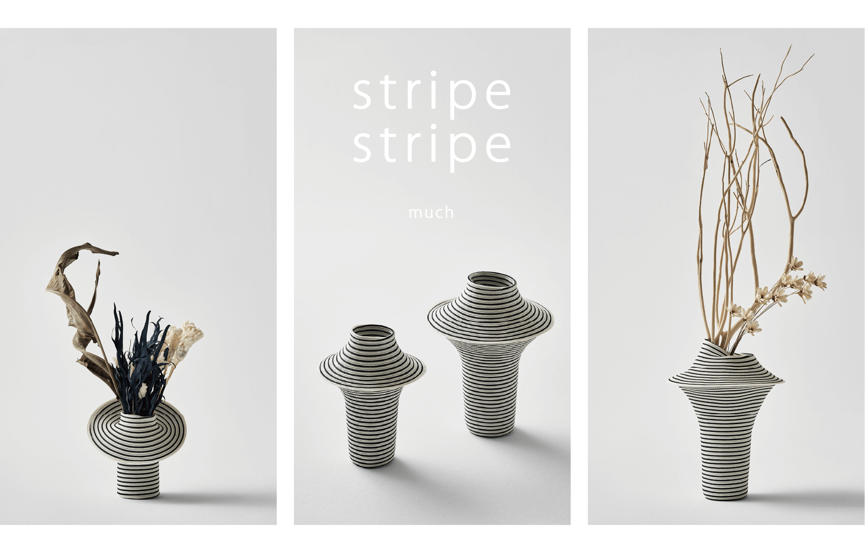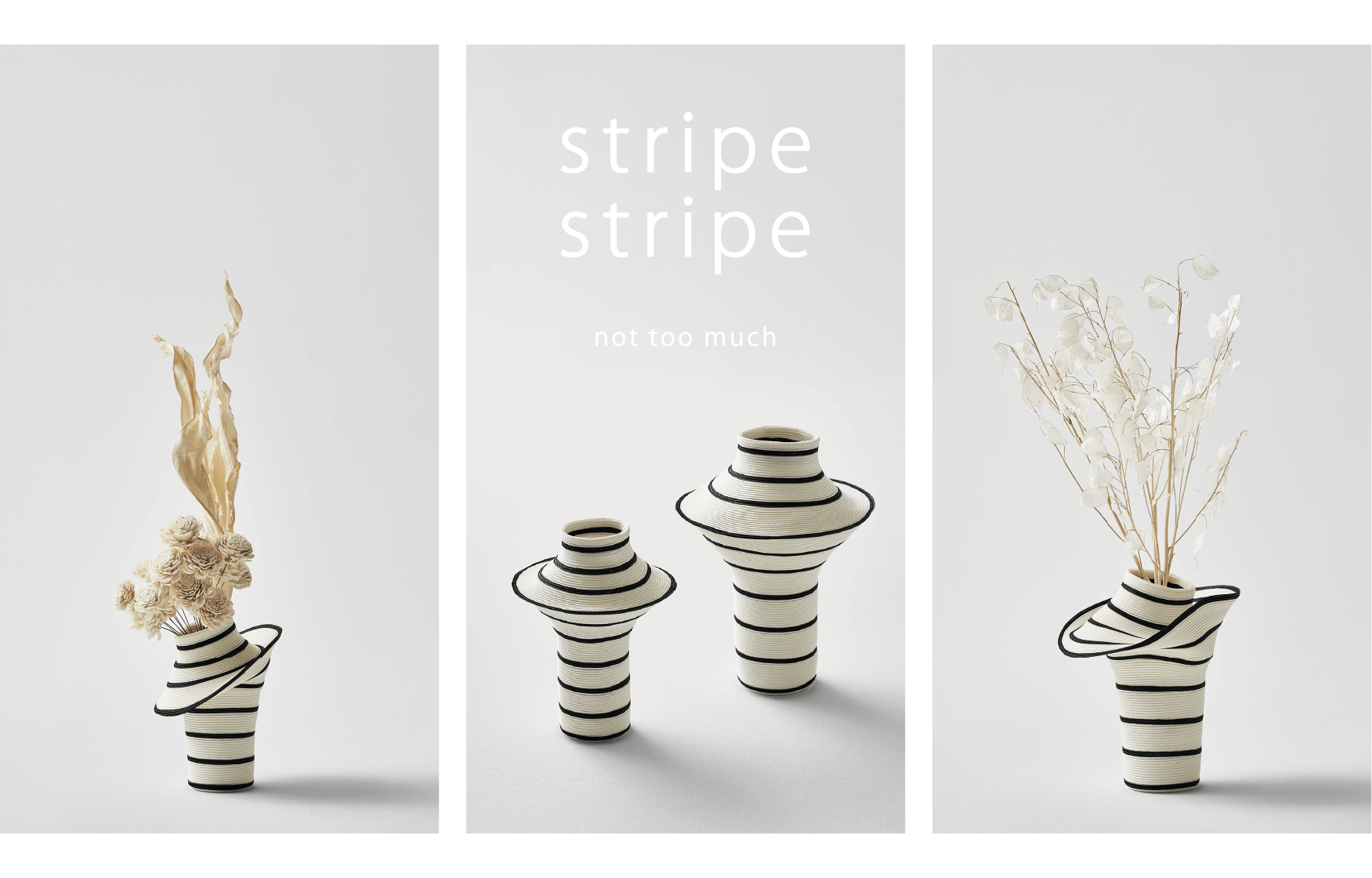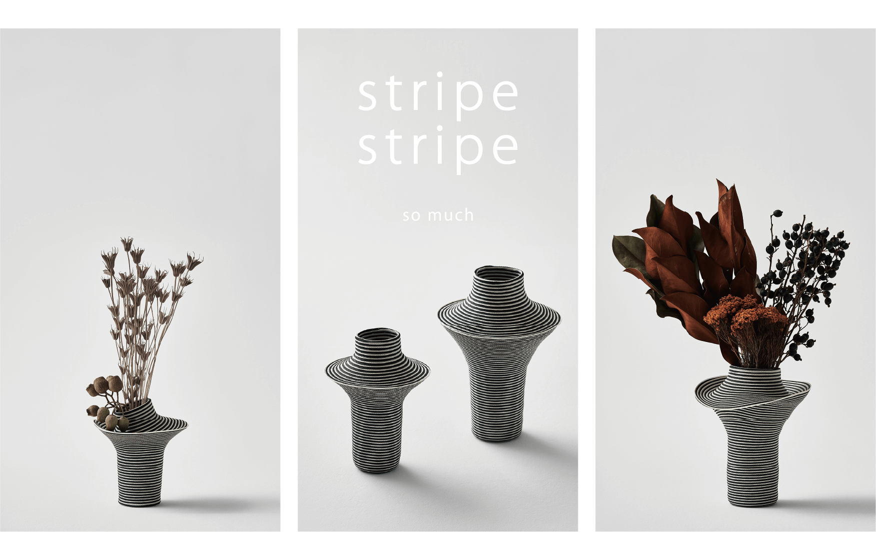 ストライプストライプは比率の異なる3種類のストライプで縫い重ねたインテリアオブジェです。目線によって真横に走るストライプ・円弧を描くストライプ。何もしなければどっしりと佇む建築物のようであり、手を加えると生命を宿したかのような躍動感をストライプが助長してくれます。 くるくる回転させればまるでダンスを踊ってるよう。単独でスポットライトを浴びても、花たちと共演しても、どちらも空間に華を添えてくれます。さて、今日はどんなストライプと戯れよう?