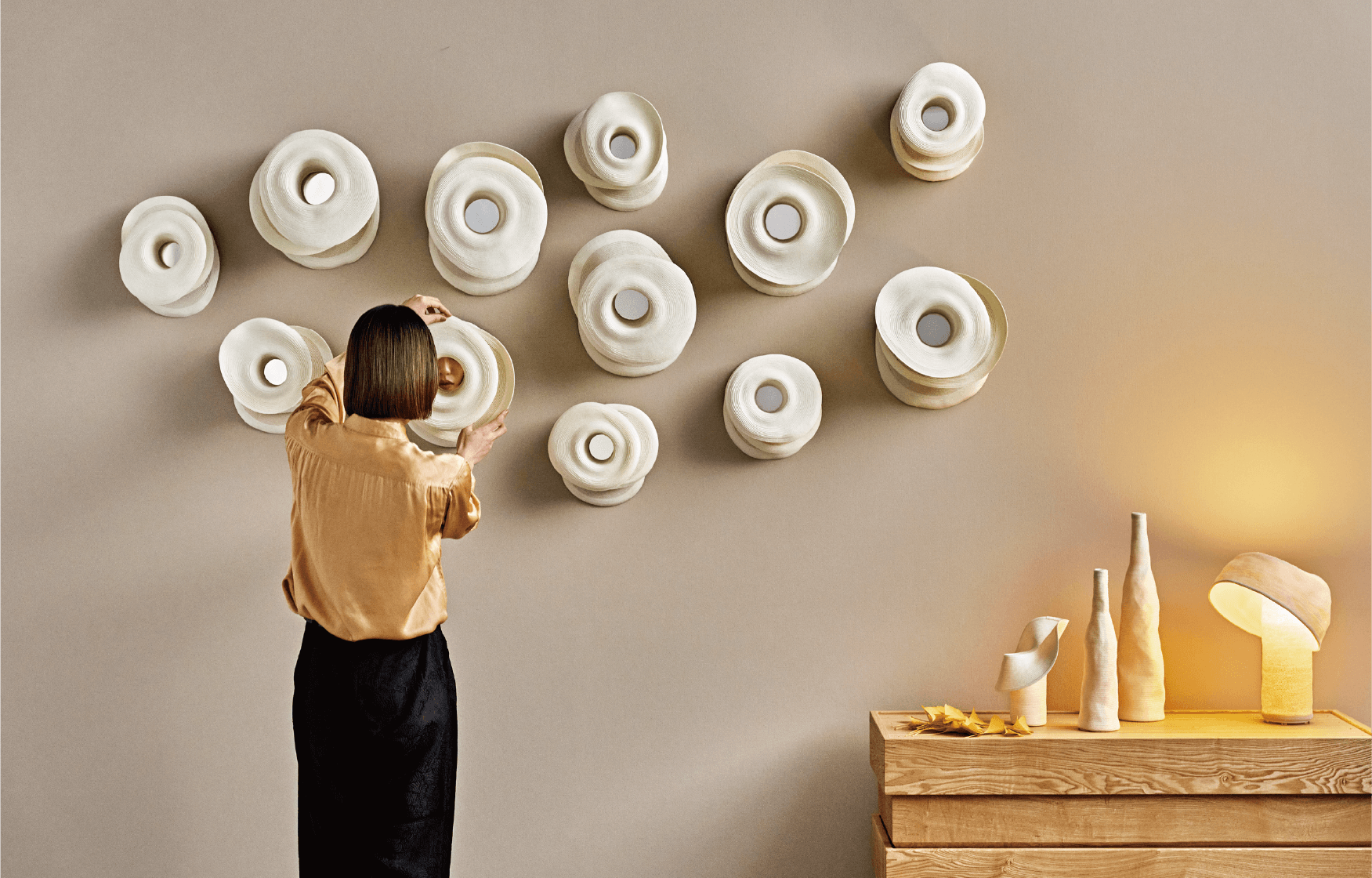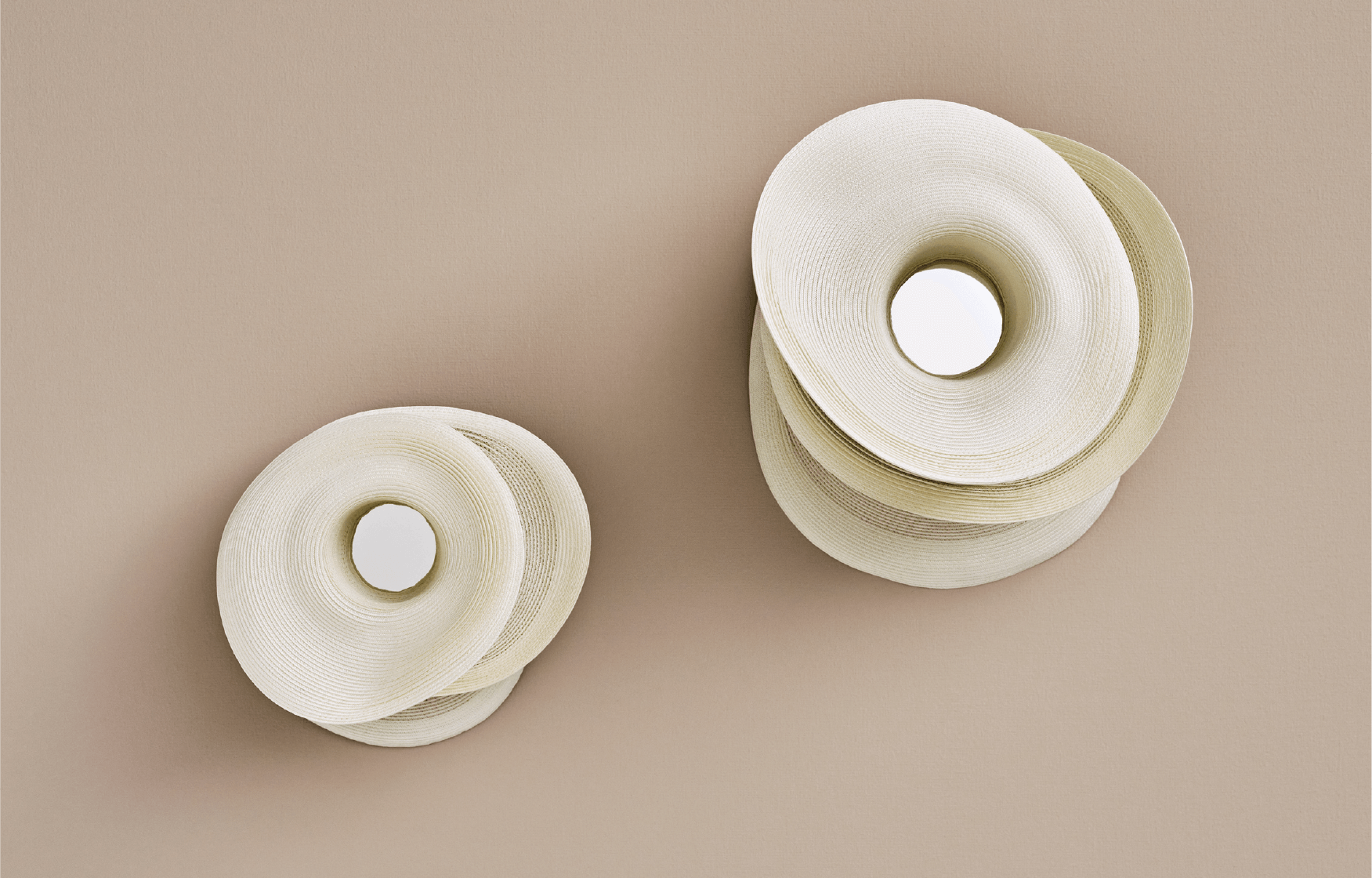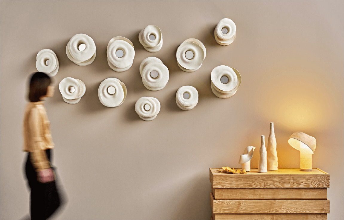 Wall petals are composed of three layers of white petals that form a single flower that seems to bloom on your wall. The recessed mirror at the center creates a sharp boundary, contrary to the soft expression of the main body, and invites you to take a peek. The gold or silver stitching on the two petals in the rear is the point color around which you can arrange the two petals in the foreground. Rotate them or pull them outward, and enjoy adding color to your walls as if they were blooming with flowers.