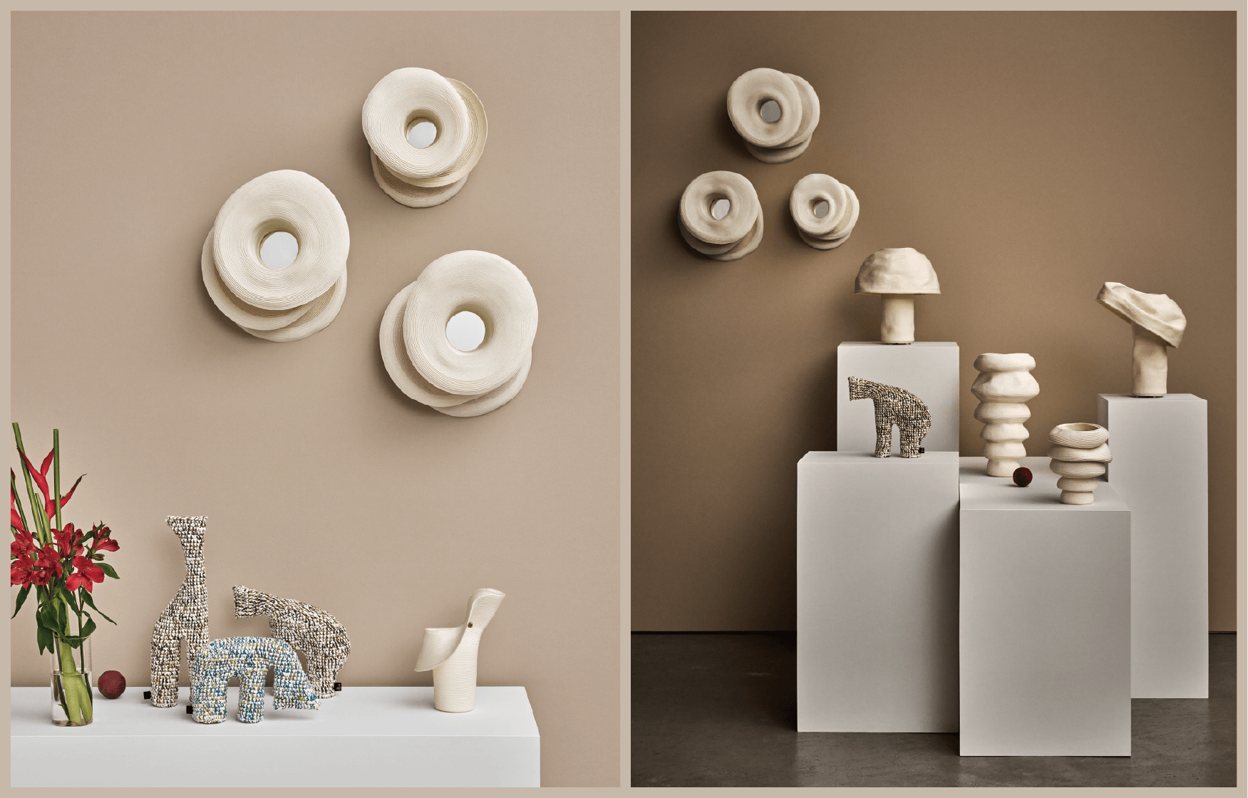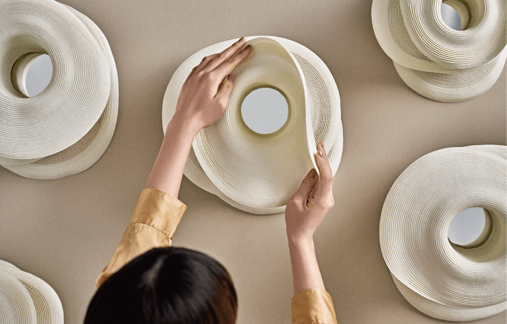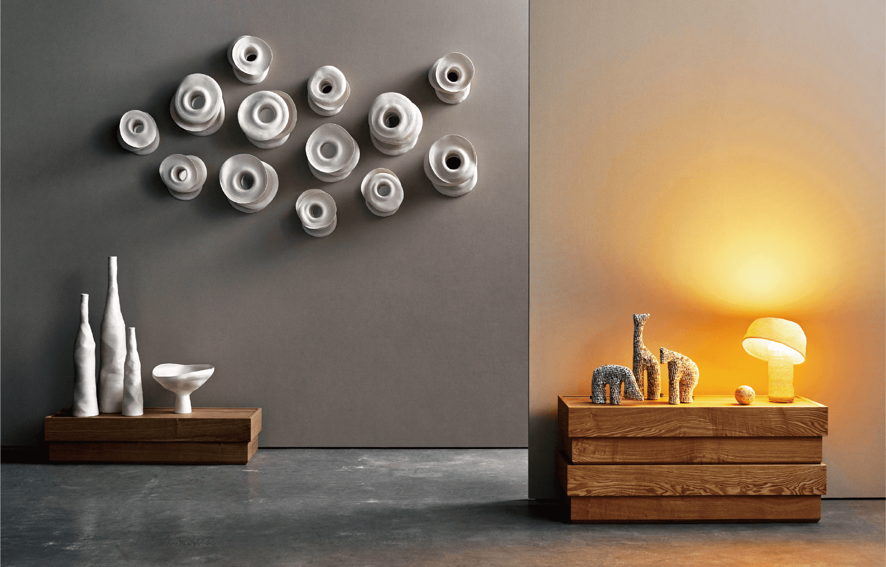 Wall petals are composed of three layers of white petals that form a single flower that seems to bloom on your wall. The recessed mirror at the center creates a sharp boundary, contrary to the soft expression of the main body, and invites you to take a peek. The gold or silver stitching on the two petals in the rear is the point color around which you can arrange the two petals in the foreground. Rotate them or pull them outward, and enjoy adding color to your walls as if they were blooming with flowers.